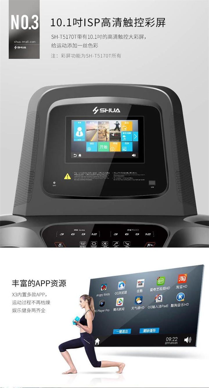 智能商用跑步機SH-T8919T-Y50(V1+)采用T2.2mm黑鉆紋(可選配:T2.4免維護跑帶)的跑帶,選用手握心率測試 自帶心率帶及增加心率控速(HRC)程序模塊測量心跳等數據,跑步寬度達580mm,可承受180kg的使用者使用。