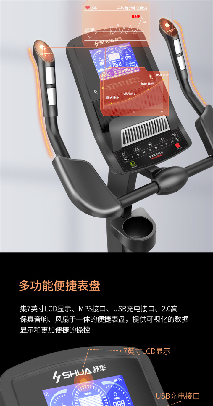 舒華立式商用健身車(chē)SH-B9100U(V10)觸屏版擁有超大顯示和操作屏幕, 可以任意設置阻力、時(shí)間和距離等參數,還可以即時(shí)顯示心跳和轉速等數據,同時(shí),SH-B9100U提供多項科學(xué)運動(dòng)處方,更輕松掌握運動(dòng)節奏。