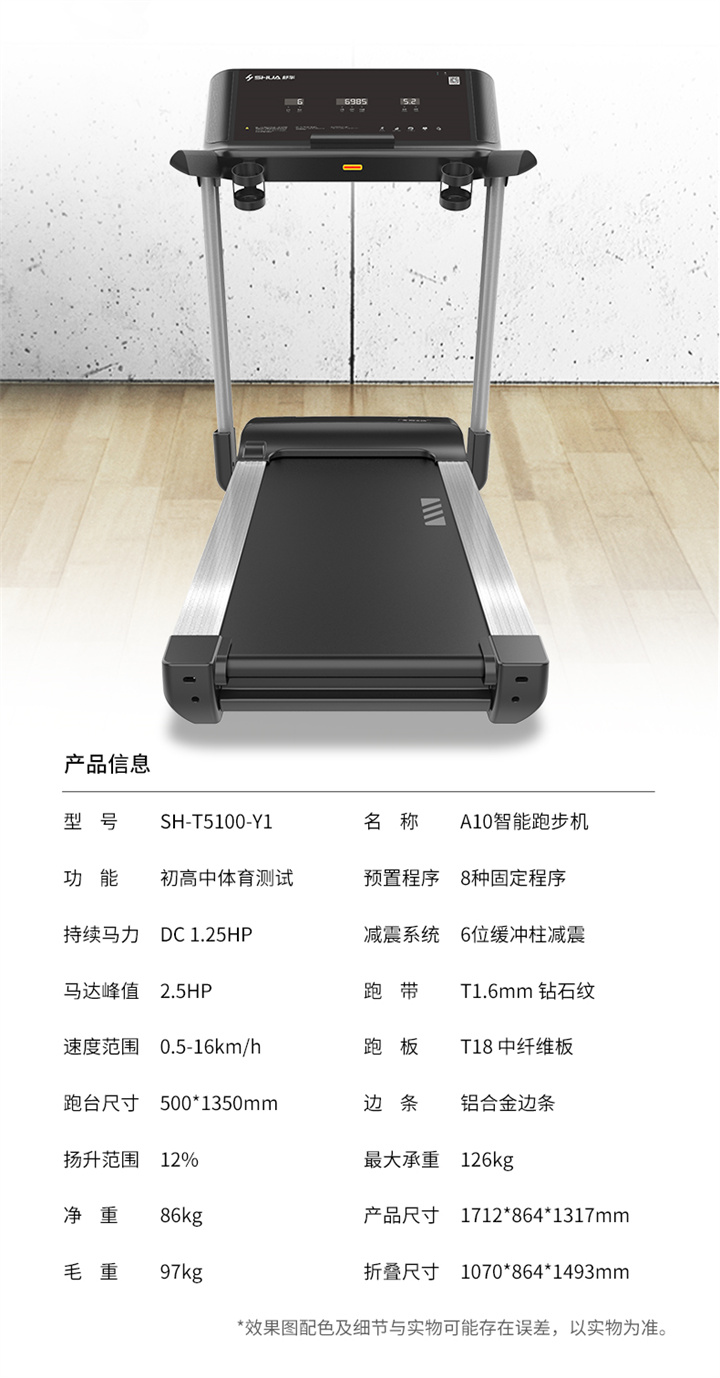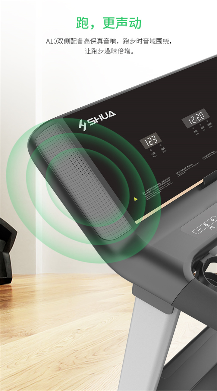舒華家用跑步機SH-T5100持續馬力達1.25HP,具有500×1350mm的跑臺,運用無(wú)線(xiàn)心率接收模塊監測心率,運用6位硅膠減震設計,最大承重是126kg,可以滿(mǎn)足大多數家庭的使用。